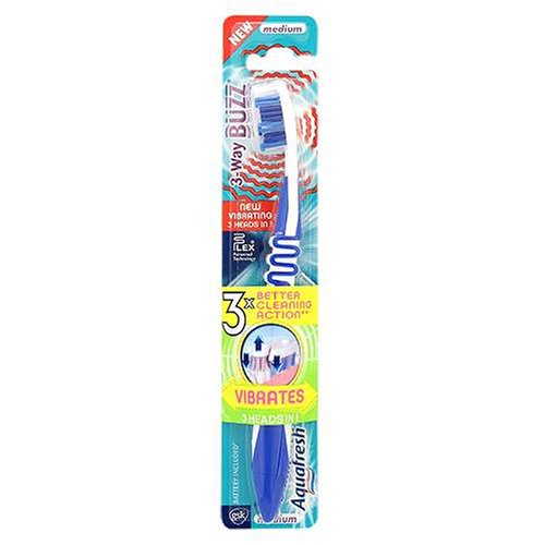 Aquafresh 3-Way Buzz Toothbrush cleans to the power of 3. Vibration- gently vibrating bristles help you to support your usual cleaning movements to give you 3x better cleaning action. 3 heas in 1- thw only Aquafresh vibrating toothbrush with 3 independaently flexing parts. Adapts to contours of teeth and gum line to thoroughly and gently sweep away plaque, even from difficult to reach areas. Flexible neck- bends to absorb excess pressure from brushing, helping to reduce the risk of damage to gums.